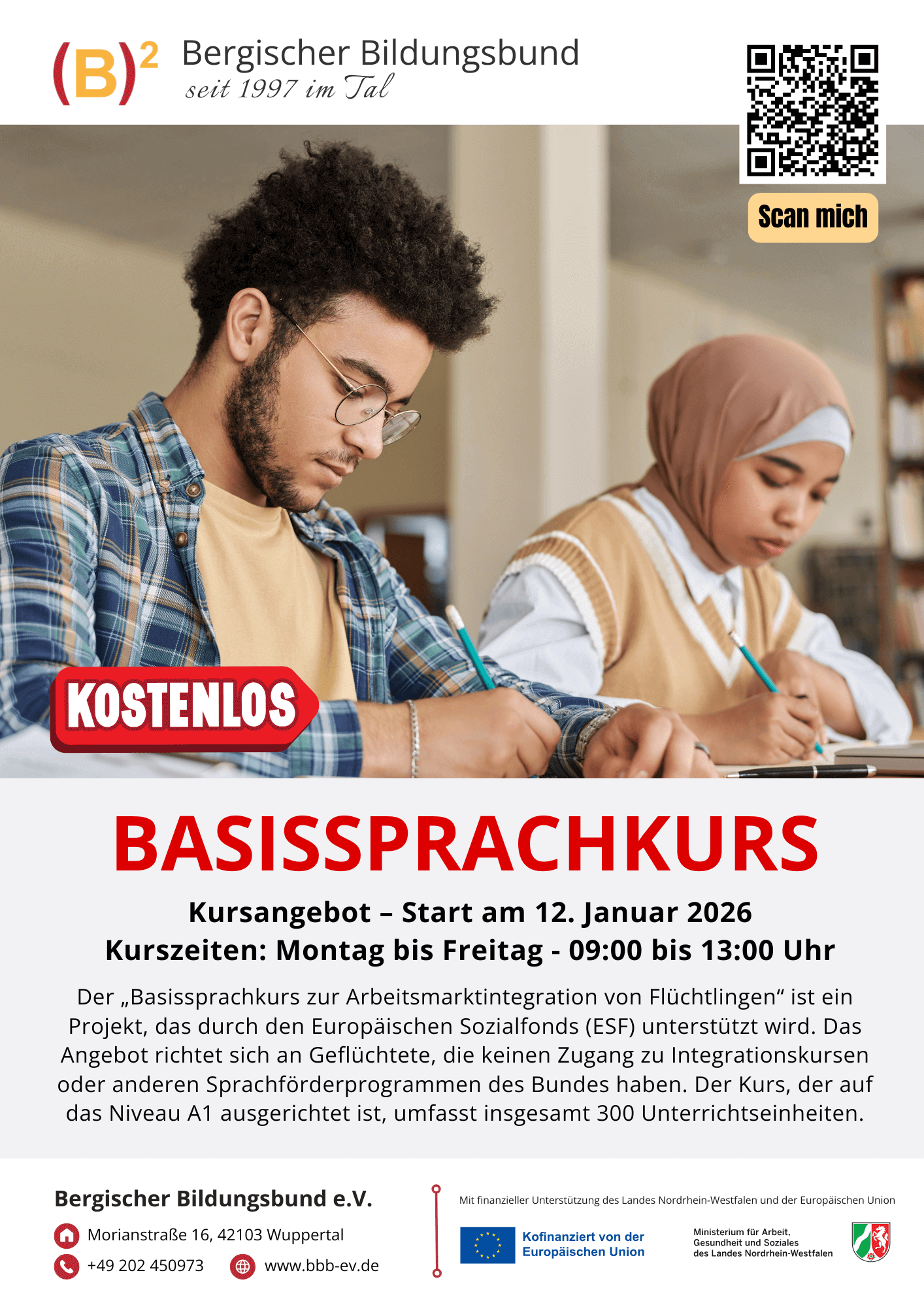 „Der Basissprachkurs zur Arbeitsmarktintegration von Flüchtlingen“ ist ein inspirierendes Projekt, das durch den Europäischen Sozialfonds (ESF) unterstützt wird. Dieses Angebot richtet sich an Flüchtlinge mit einer persönlich noch nicht endgültig geklärten Bleibeperspektive. Damit eröffnen wir diesen Personen den Zugang zur Sprachförderung, auch wenn sie derzeit keinen Anspruch auf die Teilnahme an einem Integrationskurs oder vergleichbaren geförderten Sprachkursen haben. Der Kurs, der auf das Niveau A1 ausgerichtet ist, umfasst insgesamt 300 Unterrichtseinheiten.